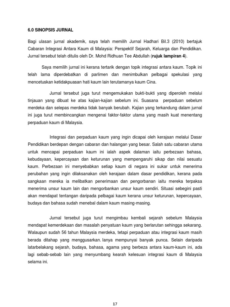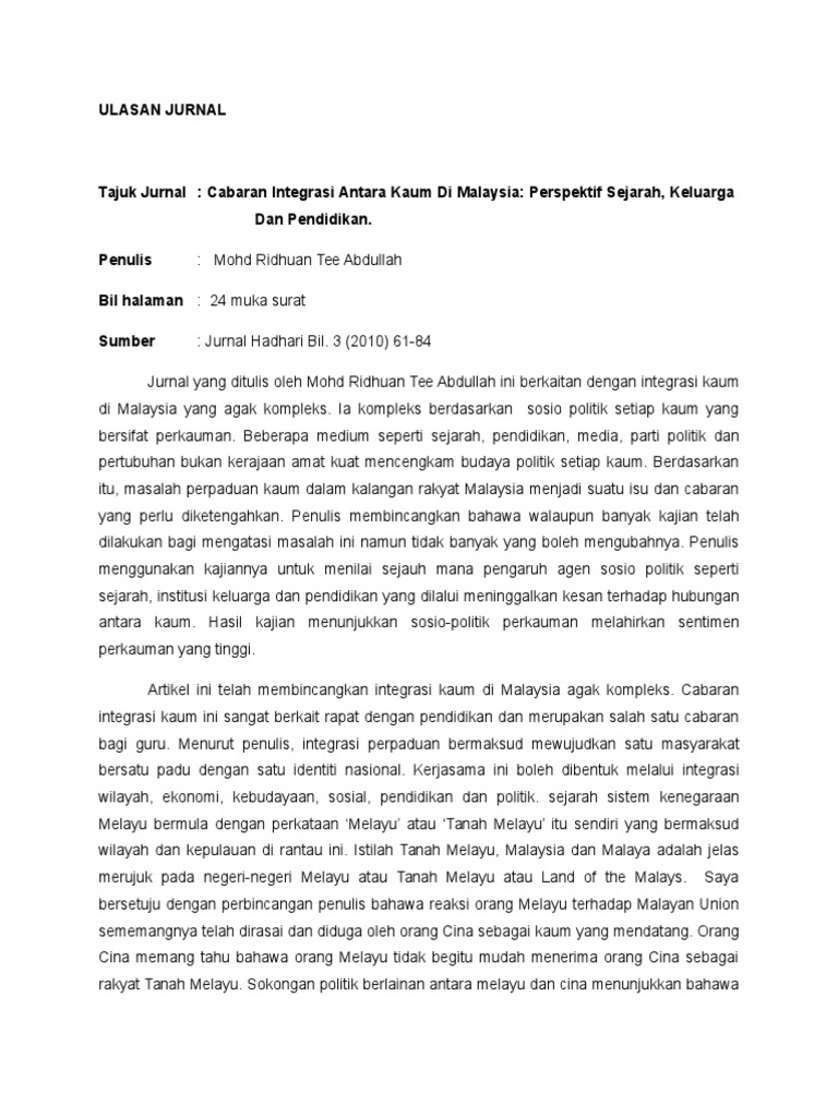 Jurnal Hadhari 2 1. Kajian berkaitan dengan integrasi perpaduan kaum di Malaysia agak kompleks. Mohd Ridhuan Tee Abdullah 2010.