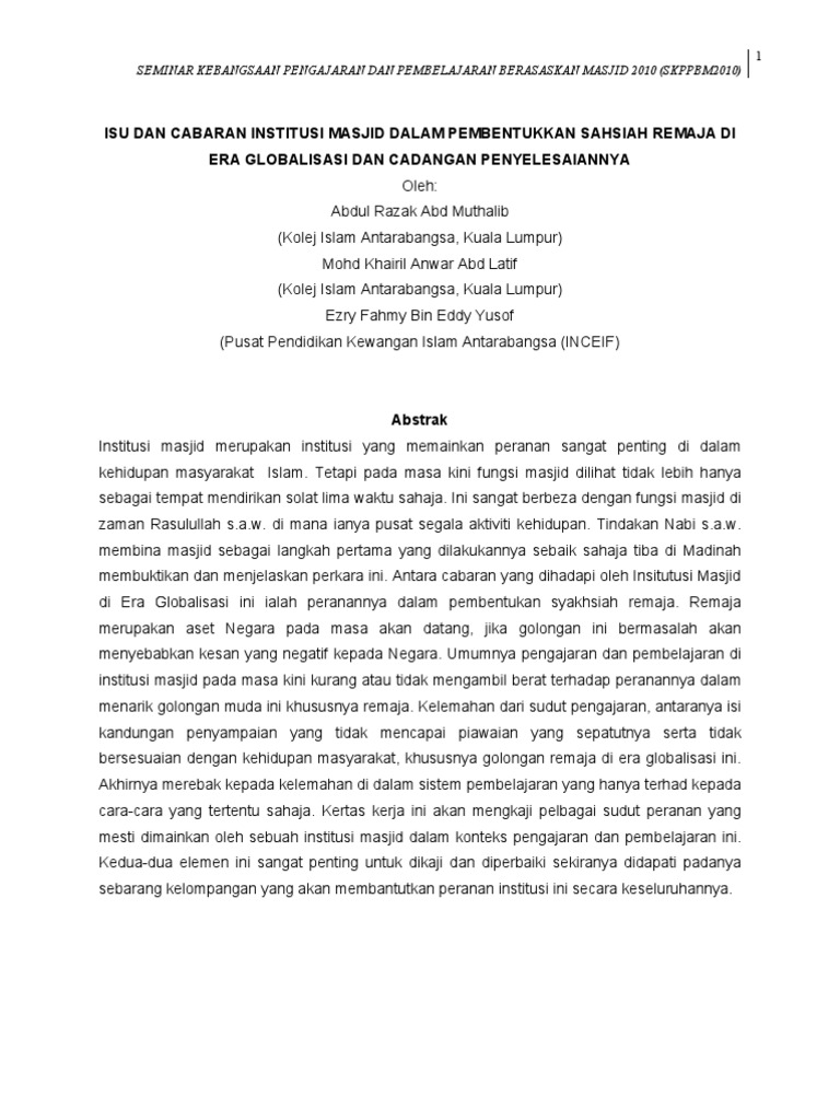 Isu Dan Cabaran Institusi Masjid Dalam Pembentukkan Sahsiah Remaja Di Era Globalisasi Dan Cadangan Penyelesaiannya