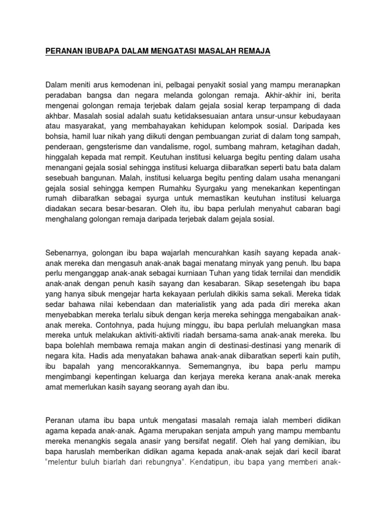 Peranan Ibu Bapa Dalam Mengatasi Masalah Remaja Karangan Bahasa Melayu Spm