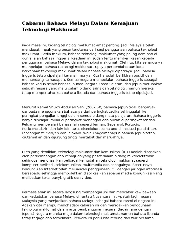 View Cabaran Bahasa Melayu Dalam Kemajuan Teknologi Maklumatdocx from JPM 1103 at Institut Pendidikan Guru Kampus Batu Lintang. But it was disturbed by the introduction of the Education Act 1996 and a directive issued by the government to use English as medium of. 14032015 Sedia maklum bahasa teknologi maklumat yang paling dominan di dunia ialah bahasa Inggeris.